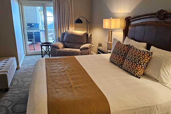 Pool View Unit with Long Porch. Includes full-size gourmet kitchen, gas fireplace, steam shower, jetted bathtub, Wi-Fi, HDR televisions, Bose SoundLink audio systems. Access to community indoor/outdoor pools, sauna and boutique fitness center. Smoke free. No pets allowed.